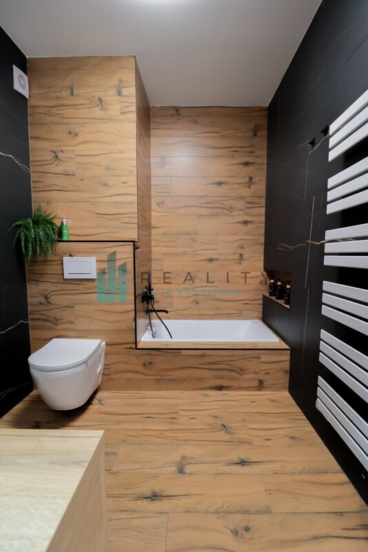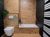 dvě koupelny jedna s vanou a druhou se sprchovým koutem a dvě toalety,